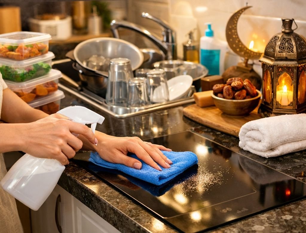 لا تتركي الدهون حتى تجف، فالماء الدافئ مع القليل من سائل الجلي كفيل بإزالة البقايا بسرعة وفعالية. التعامل الفوري مع الأواني يمنع تراكمها ويجنبك مشهد “جبل الصحون” المرهق بعد الإفطار. ولا تنسي مسح أسطح العمل والموقد باستخدام بخاخ مطهر وقطعة قماش من الميكروفايبر. في رمضان، تتطاير الزيوت والصلصات أثناء التحضير، ومسحها وهي لا تزال رطبة يوفر عليك مجهودًا مضاعفًا لاحقًا.
