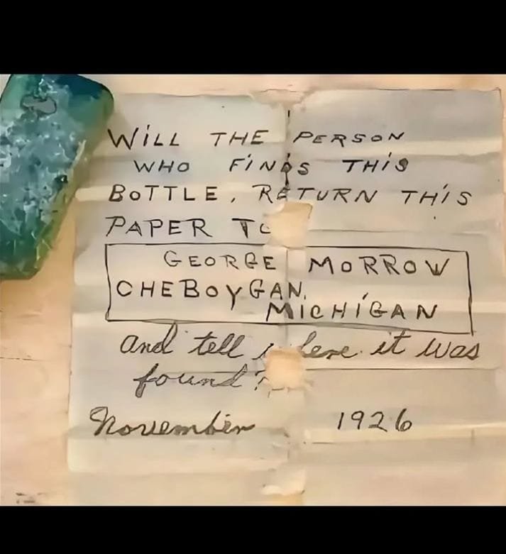 وكتب بالرسالة: “هل يمكن لمن يجد هذه الزجاجة أن يعيد الورقة إلى جورج مورو، شيبويغان، ميشيغان، ويخبره أين وجدت. نونبر 1926”.