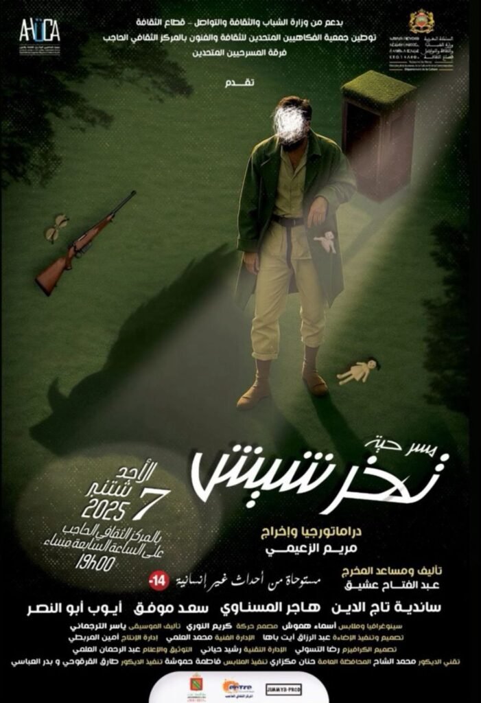 المسرحية، الموقَّعة دراماتورجياً وإخراجياً باسم مريم الزعيمي، ومن تأليف الفنان عبد الفتاح عشيق. تسعى إلى مقاربة قضايا اجتماعية ونفسية من خلال لغة مسرحية حديثة تمزج بين الرمزية والواقعية.